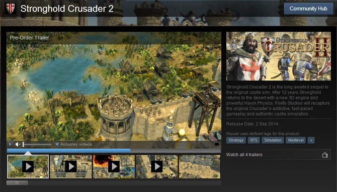 | Stronghold Crusader 2 is the 2014 sequel of the original Stronghold Crusader, now bringing the arid desert and cruel warfare of the Crusades into 3D. With improved graphics and better performance over Stronghold 3, Crusader 2 also revamps the dynamics and detail of the gameplay with countless newfound units and events.
